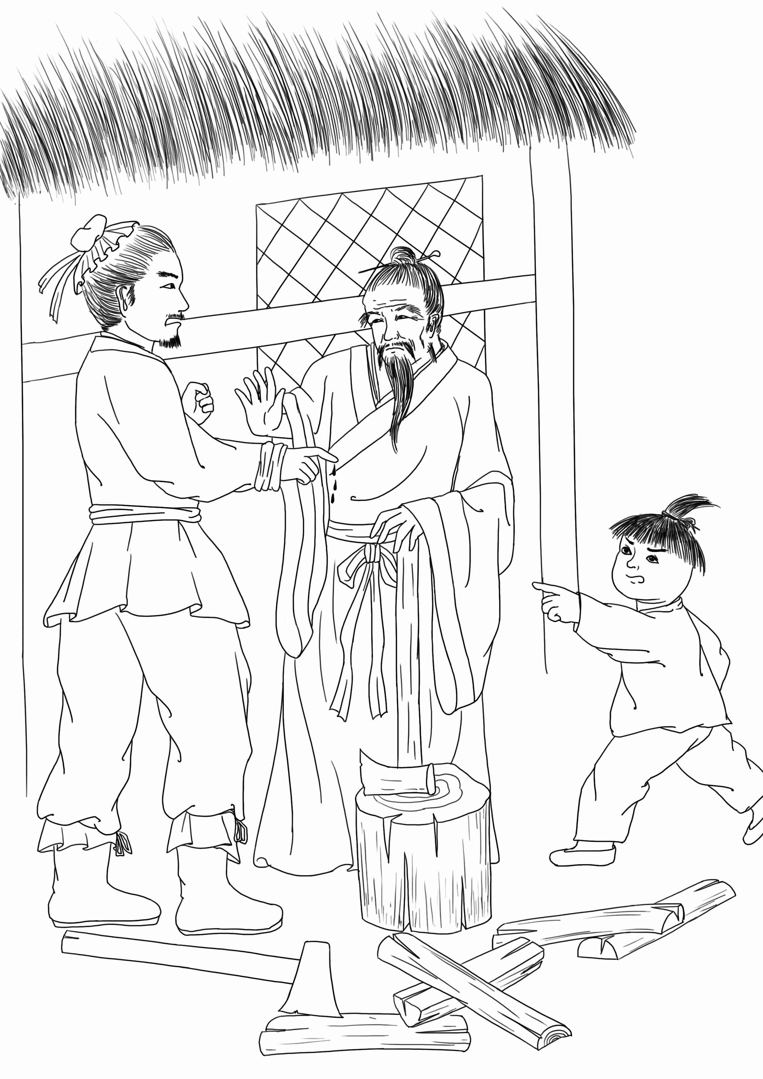 父子一同劈柴,父亲拿着斧头,误伤了儿的手指。儿子大怒骂道:“老乌龟!你眼睛瞎啦?”孙儿在旁,见爷爷被骂,很生气,便说:“狗肏的,父亲可是骂得的么?”