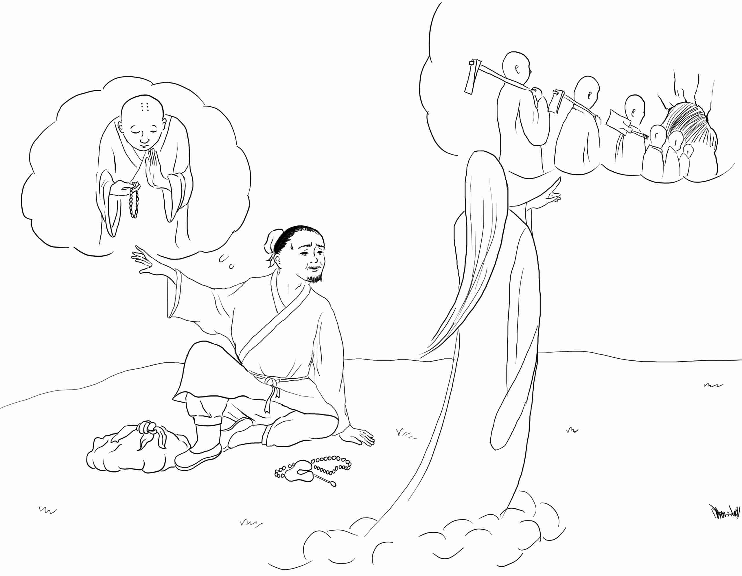 有一个人不相信佛,死后冥王给他处以重罪。这个鬼魂就把所有的家当用来请鬼僧念佛求超度,到处找不到鬼僧。就问一鬼:“这里没有鬼僧吗?”答:“来是来得多,都打入十八层地狱之下为冥王挖煤去了。”