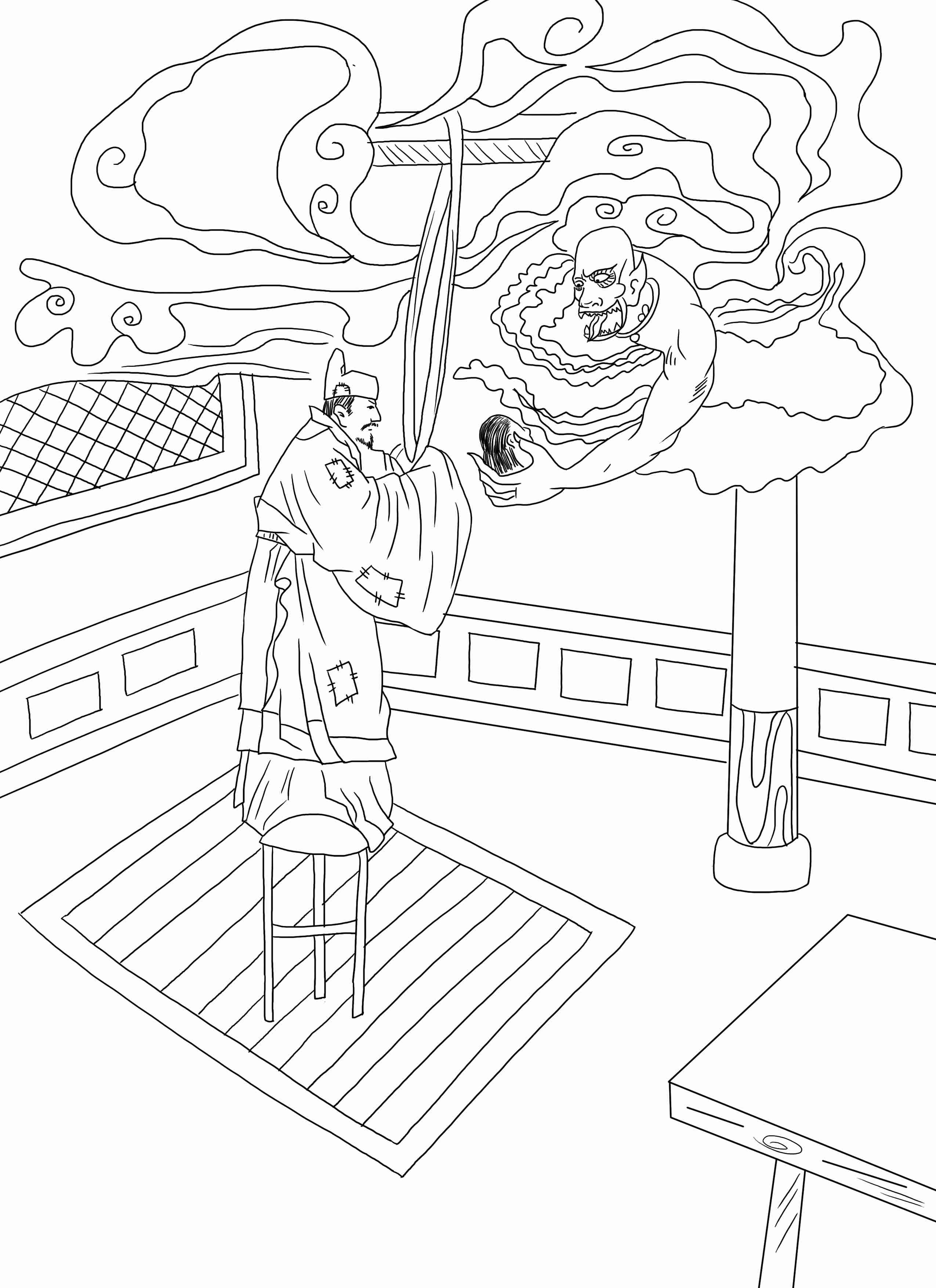 有一人好赌,家产输得精光;无法生活下去,不想活了,取绳上吊。忽然看见一鬼在梁上说:“快拿头来。”赌鬼说:“亏你也开得口,我输到这般地步,还来问我要头。”