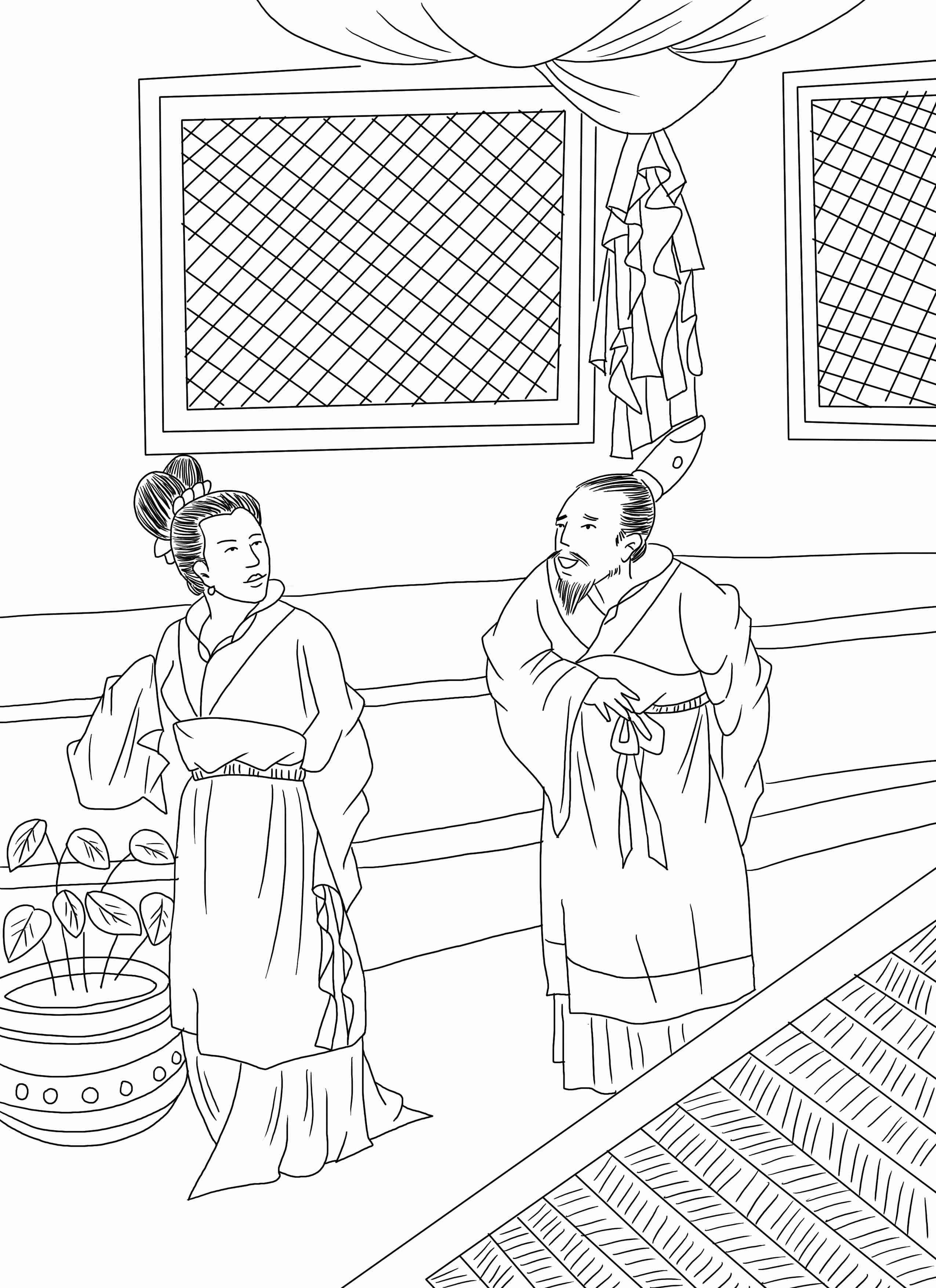 有一家卖床和榻足凳的,一天丈夫出外,叫妻子守店。有一个人来买床,给的价不高,银子又是八折的,讨价还价很久,还是勉强卖了。第二天,这人又来买榻足凳,妻子说:“这个人也太贪心了,昨天在床上占我的便宜,今天又想在榻上占我的便宜。”