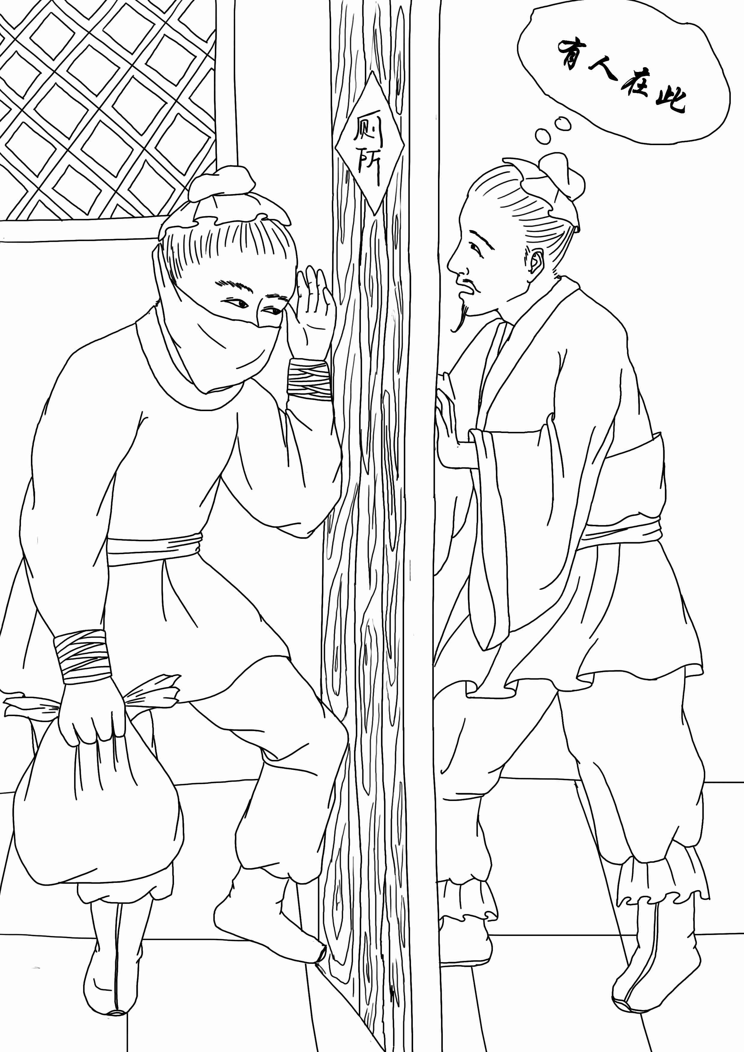 一痴人闻盗入门,急写“各有内外”四字,贴于堂上。闻盗已登堂,又写“此路不通”四字,贴于内室。闻盗复至,乃逃入厕中。盗踪迹及之,乃掩厕门咳嗽曰:“有人在此。”