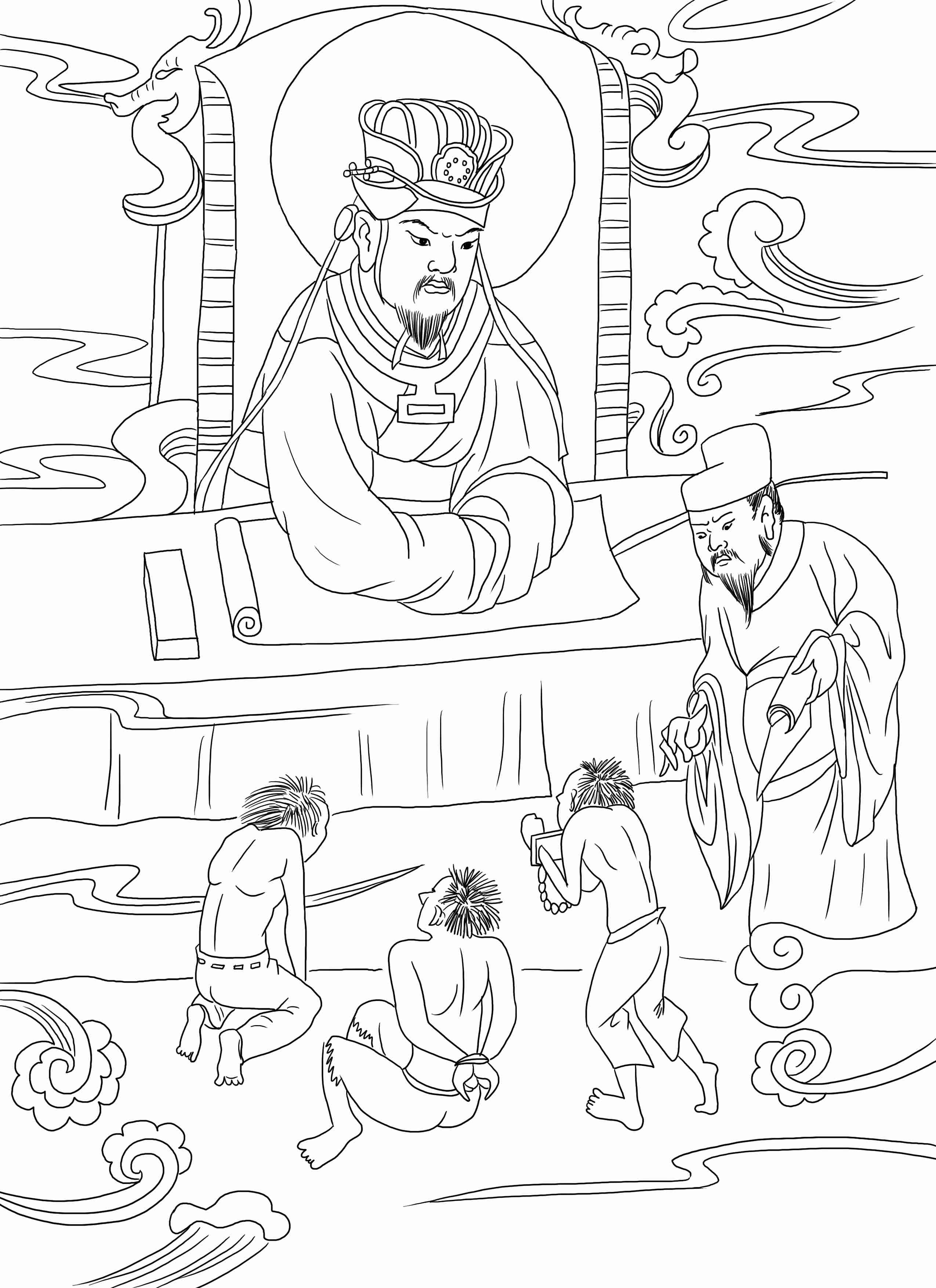 阎王差鬼卒拘三人到案,先问第一个:“你生前作何勾当?”答云:“缝连补缀。”王曰:“你迎新弃旧,该押送油锅。”又问第二个:“你作何生理?”答曰:“做花卖。”王曰:“你节外生枝,发在油锅。”再问第三个,答曰:“糊鬼脸。”王曰:“都押到油锅去。”其人不服,曰:“我糊鬼脸,替大王张威壮势,如何同犯此罪?”王曰:“我怪你见钱多的,便把好脸儿与他,那钱少的,就将歹脸来欺他。”