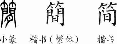 “简”是形声字。小篆从竹,间声。隶变后楷书写作“簡”。汉字简化后写作“简”。