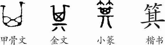 “箕”是象形字。甲骨文像簸箕之形。金文的形体与甲骨文大体相同。小篆另加义符“竹”。隶变后楷书写作“箕”。