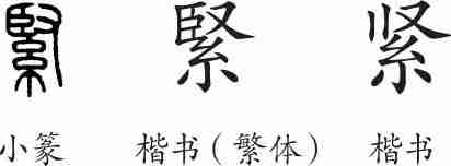 “紧”是会意兼形声字。小篆从臤(手抓得很牢),从絲省,会丝弦拉紧之意,臤兼表声。隶变后楷书写作“緊”。汉字简化后写作“紧”。