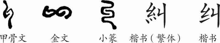 “纠”本为象形字。甲骨文像藤蔓或两束丝线纠缠在一起。金文更加形象。小篆与甲骨文、金文相似。隶变后楷书写作“糾”。汉字简化后写作“纠”。