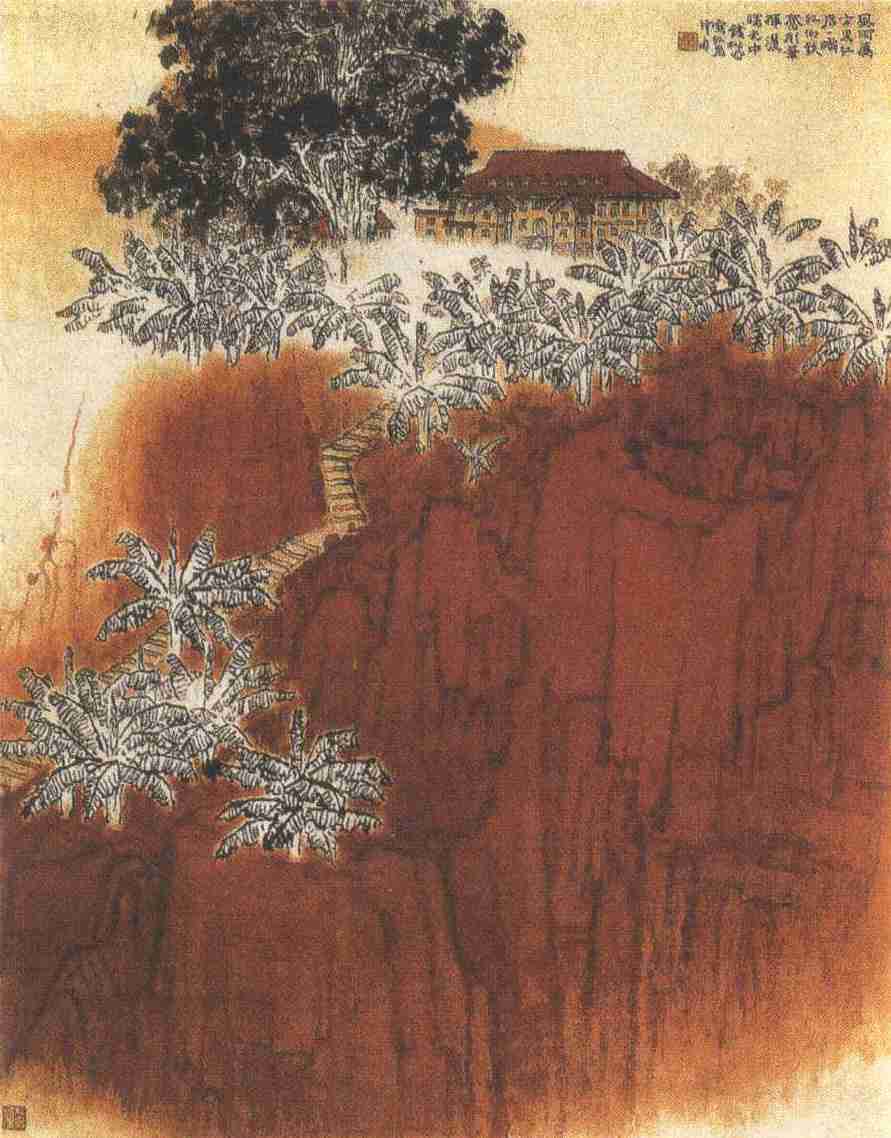1960年9月,钱松喦旅行写生,经历了二万三千多华里,到四川重庆,便至化龙桥瞻仰了红岩村。抗日战争时期,这里是中共中央南方局和第十八集团军驻重庆的办事处所在地。画家经营此图,前后三年,易稿几十次,上色的画稿有近百幅,才最后定稿。作者用凝重顿挫的长线条勾勒大块岩石(原系土黄色的坡地),敷以朱砂,再用牡丹红(加胭脂)复加皴擦,色泽庄重宏亮,仿佛凝聚了浩然大气。坡石间分植芭蕉二三十本,纯用白描双钩,略施淡赭水于若干棵枝间,虚灵端重,空间感强,却宛若一群长经风雨、久历战斗的猛士,和朱红色岩石相映辉,形成了强烈对比,增强了艺术感染力。一株大檞树巍巍昂立,俨如一位严守岗位的卫士,在前面蕉石、后面大楼遥遥相接处屹立着,极见威严。图中的办公楼房,是当时办事处的办公大楼,由工作人员自己动手,将红岩村十三号“大有农场”一幢三层楼房重建而成。作者将屋顶盖以红瓦,墙面刷上淡赭,楼后大山,用淡朱磦色抹过,天空微微烘染藤黄水,全图是深深浅浅的暖色,办公楼宛若一座红色纪念馆,使观者油然而生“高山仰止”的崇敬感。