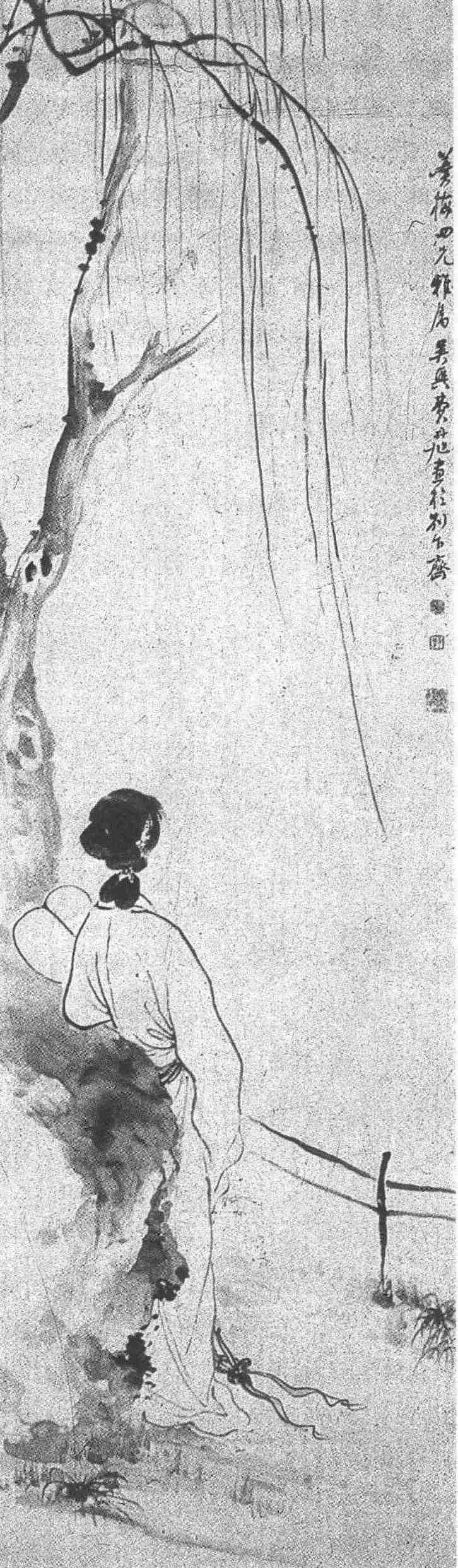 此图章法精洁概括,意境清幽,笔调松秀。庭园柳阴下一背而侧的女子左手持纨扇,依于石旁,婀娜丰姿,若有所思。以泼墨法作石,连勾带染作树干,柳条随意抒写,若临风曳摇。女子发髻作数笔浓墨而有层次,质感甚强;以写意笔法作白描服装,流畅的衣纹与凝重的墨石对比鲜明,更衬托出人物。明唐志契《绘事微言》曰:“善露者未始不藏,善藏者未始不露。景愈藏,境界愈大;景愈露,境界愈小。若主露而不藏,便浅而薄。”费氏在这一画面上,正具有“景愈藏,境界愈大”的特色。所画的东西很少,只是局部一树一石、一栏杆,展现庭园的一角,却以少胜多,以简胜繁,单纯而不单调,不完整中更见完整,只画女子背而侧面,却比画正面更含蓄,更耐人寻味,她是在伤春?还是在觅句?观者可以概括自己的生活经历去揣测、去联想。这种处理手法,真可谓“虚实相生,于无画处皆成妙境”(笪重光《画筌》)。