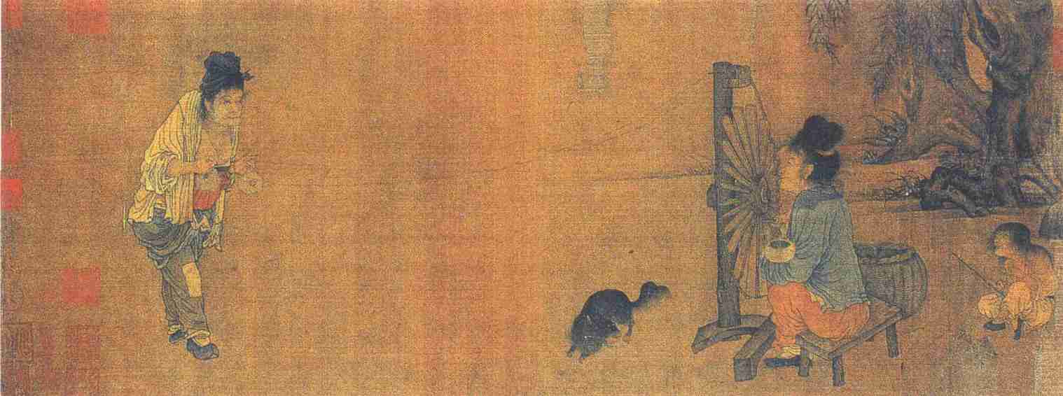 《纺车图》是北宋前期遗存不多的风俗画代表作品之一,表现了当时农村妇女在大树下纺纱的情景。画面很简单,左侧一个老妇人两手牵线;右侧一个中年农妇怀抱婴儿,一手摇动纺车;她身后一个顽童坐在地上,手持小竿,拴着青蛙游戏;她身前还有一只小犬在嬉耍。景物设置更为简略,右上角画了两段老树的粗干盘根,几串柳叶垂下,一条土坎,点点青草。
