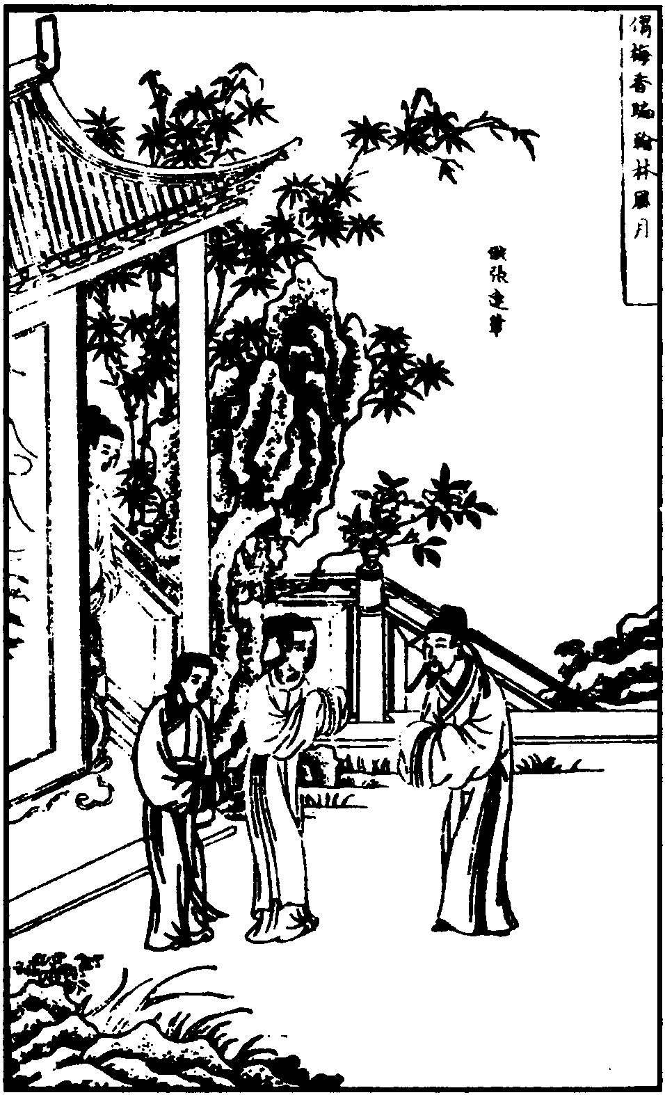 【赚煞】 你道信步出兰庭,庭院悄人初静,静听是弹琴的那生。生猜咱无情似有情,情知咱甚意来听。听沉罢过初更,更阑也休得消停。停、待甚忙将那脚步儿行,行过那梧桐树儿边金井。井阑边把身躯儿掩映,映着我这影儿呵,好着我嫌杀月儿明。