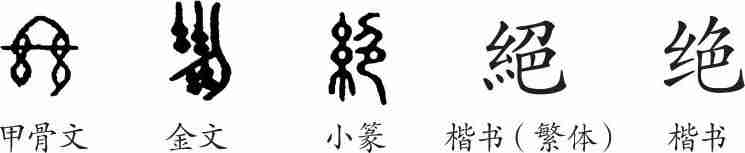 “绝”是指事兼会意兼形声字。甲骨文从悬丝,一横指出将丝截断。金文复杂化,成了会意字。小篆简化,并另加声符“卩”(jié)。隶变后楷书写作“絶”。汉字简化后写作“绝”。
