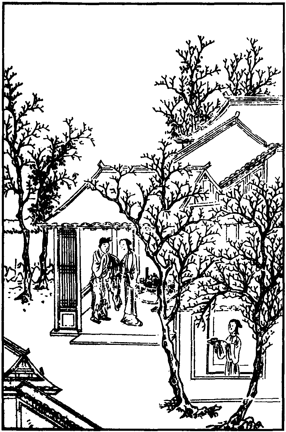 (小旦)你敢是荥阳郑公子么? (生) 我就是郑元和。(小旦) 呀! 姐姐,郑姐夫在此! (旦) 在那里?(小旦) 这不是他! (生) 奶奶,求讨些。(旦)这就是他?天那!