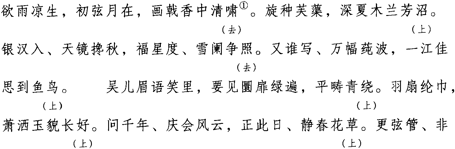 本格双片一百零四字。全词同韵,仄韵,韵字可上声、可去声。韵段内可撤句造句,但须保持其字数不变,见赵必瑑词。另有一百零三字体,见张炎词。此调始见于南宋史达祖《梅溪词》。