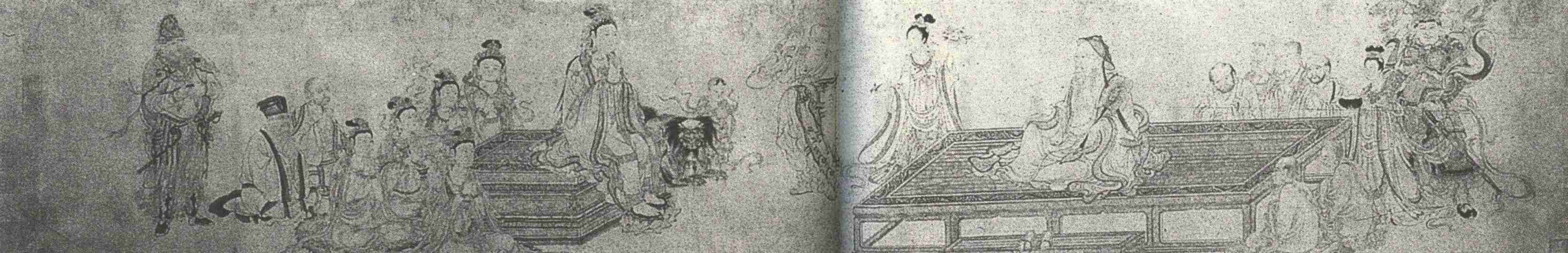 这幅画的另一突出特点和成功之处,是作者的白描功力,使但凡见过原作的,无不叹为观止。衣纹长带,飘举飞动,流畅遒劲;坐榻香几,刻画精微,不板不滞。如此众多的人物和家什,线条繁复,千笔万笔,无一笔不妥帖。潇洒处,能收能紧;细微处,能展能放。正所谓“疏可走马,密不通风”,有这惊人功力的白描技巧,它的作者无疑是一位赫赫有名的画家,所以在画幅后明朝人沈度、王穉登、董其昌等人的题跋,都认定是北宋李公麟的作品,因为李公麟是有名的白描画大师。其实他们几位都是无根据的猜度,真正作者是金国画家马云卿。