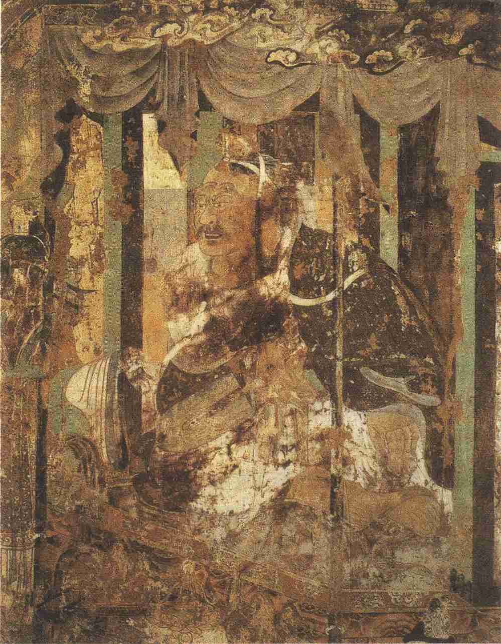 此壁画用笔吸收了吴道子“挥霍若莼菜条”圆浑劲健的体势,衣褶结构紧密,佛典中现身说法“智慧辩才”的代表人物跃然纸上,极富艺术感染力。