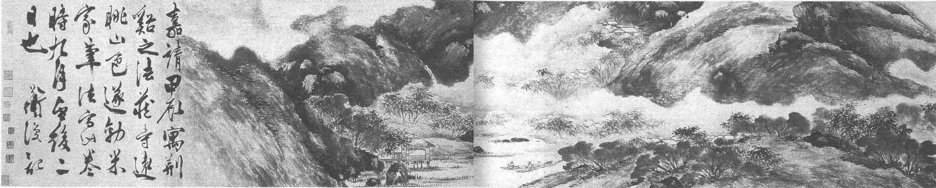 此图长近五米,宽五十五厘米,应该称得上大手卷了。长卷的构图犹如写文章,有起转承合的讲究,由多组景色联缀而成。然而陈淳却不以为然,他不受长卷构图通常的框架束缚,只将一眼所能收尽的景色放入狭长的画面,一个透视,一种角度,犹如照相机超广角取景。因此,展卷便一目了然,画家意在用明明白白的山水形象,来诉说自己与大自然亲近后的感受。虽是构图的一目了然,形象的明明白白,可在这了然和明白之中,有着曲折、深奥的艺术构思。自右至左,是一个由近景到远景而回复到近景的视线转移的过程,随着从浅山平岗到高峰峻岭的山水形象的逐次升级,笔墨状态也从轻描淡写向重笔浓墨逐次厚实。中段画得明快秀逸,而且云山飘渺,层次丰富,远眺的意境跃然纸上。两端为近景,右端是铺垫,应视作中景,左端最为突近,山不见顶,云埋其中,密树深谷,水阁村落,一派清幽境象。画家费了大力气表现出的中景和近景,完全是为了他极不经意的中段远景。其实,画家最不经意的恰是他最得意的。他在跋中写道:“嘉靖甲辰,寓荆谿之法藏寺,远眺山色,遂效米家笔法写此卷。”中段的远景确实出色,笔致旷放淡然,无一点尘氛,但是,倘若没有近景作衬作陪,远眺的意境便要大打折扣。