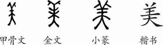 “美”是会意字。甲骨文像一个正面站立的人。金文中,人头上的饰物更为复杂了。小篆直接承接金文。隶变后楷书写作“美”。