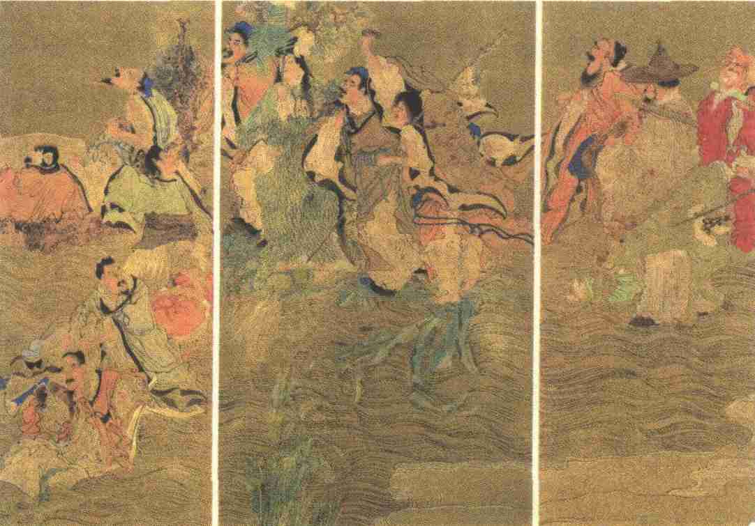《群仙祝寿图》是画在一张光滑的金笺上,在这种纸上用石青、石绿、朱砂、铅粉等浓厚色彩是最难的,可是任伯年运用得非常匀贴,鲜艳夺目,而且很调和,足见他技巧的高超,值得人们揣摩和学习。