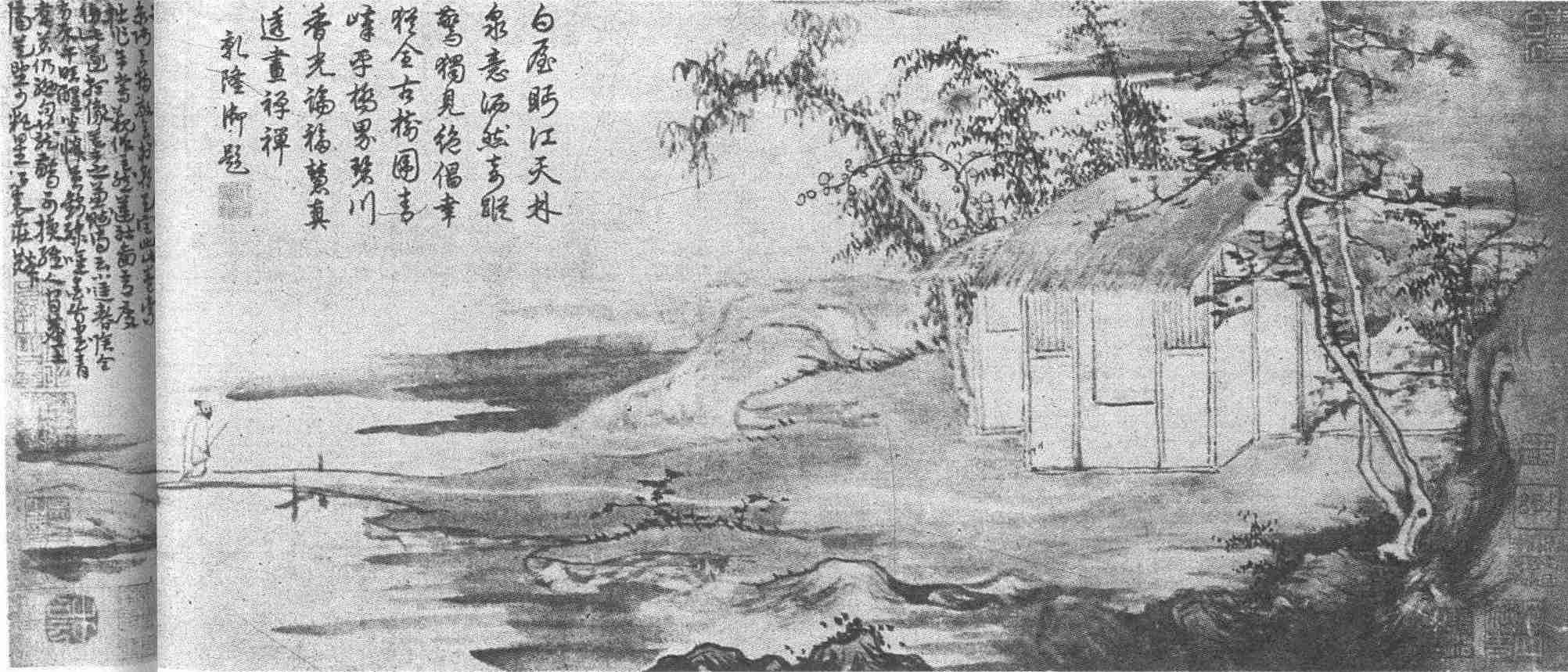 作者还在画面上题写道,他因为看过了巨然的《莲社图》,非常向往其情境,所以凭着想象进行模仿。但事实上这幅画与巨然的作品完全两回事,重要的不在形式技法,而在于他想在意境上达到文人理想中的高度。由于这么一种内心的推动,使他在运笔运墨时能够充分自由自在,大大增添了画面的写意性。对笔墨的变化,他也控制得较成功。不但用大笔涂抹出景物环境的特点,而且有浓墨点染近处的树梢枝干,给这疏淡的画面结构提神醒目的概括。作者能在不经意中见出对绘画语言自身特性的掌握能力,确实不容易。也说明元代画工的艺术表现力已具有深度。