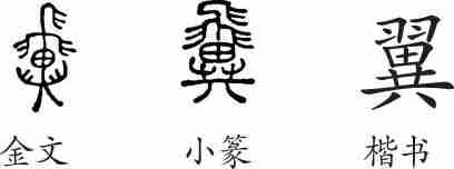 “翼”是会意兼形声字。金文从飛(飞),異(异)声。小篆承接金文的形体并整齐化。隶变后楷书写作“翼”。