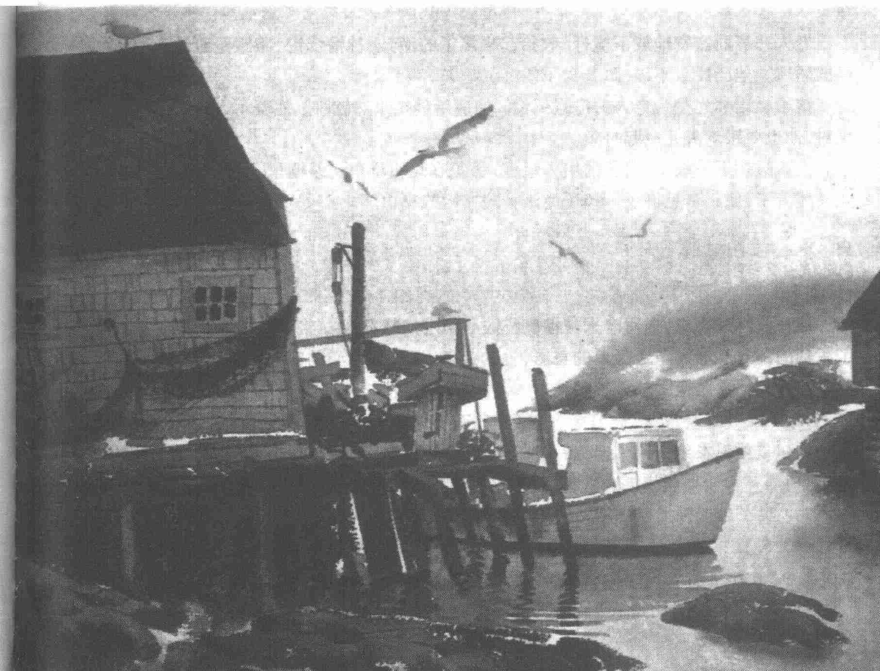 船驶进小港湾的时候,餐馆的灯已经灭了,他知道大家都在睡觉。风不断加码,现在正吹得紧。不过港湾里静悄悄的,他径直驶到乱岩下那一小片卵石海滩跟前。没一个人来帮忙,他只好把船尽自己力气往上划。然后他走出船来,把它拴在岩石上。