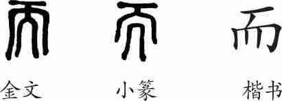 “而”为象形字。金文向下垂的四条线,就像下垂的颊毛之形。小篆的形体基本上与金文相同。隶变后楷书写作“而”。