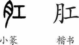 “肛”是后起字,为形声字。楷书写作“肛”,从肉,工声。