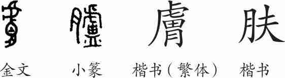“肤”是形声字。金文从肉(月),声。小篆从月(肉),盧声。隶变后楷书写作“膚”。汉字简化后写作“肤”。