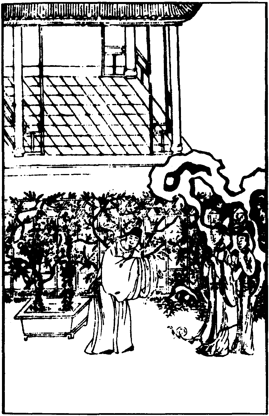 【石竹花】 (贴) 语话低声怕隔墙,悄地写情词半张。(生) 再三祝付小梅香,须用些花言包奖。休得要漏泄天机,怕耽阁这两厢。全仗你寄语窈窕娘,代诉小子的苦衷肠,若得他玉人儿从天降,也不枉胭脂红染汴梁江。