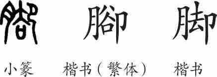 “脚”是会意兼形声字。小篆从肉(月),从(腿脚),会腿脚之意,兼表声。隶变后写作“腳”。汉字简化后写作“脚”。
