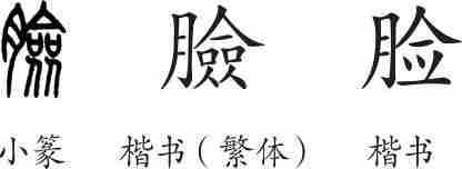 “脸”是形声字。楷书繁体写作“臉”,从月(肉),僉声。汉字简化后写作“脸”。