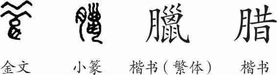 “腊”是形声字。小篆从肉(月),昔声。汉字简化后写作“腊”。后来又作了“臘”的简化字。