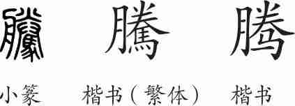 “腾”是形声字。小篆从馬(表示与奔马有关),朕声。隶变后楷书写作“騰”。汉字简化后写作“腾”。