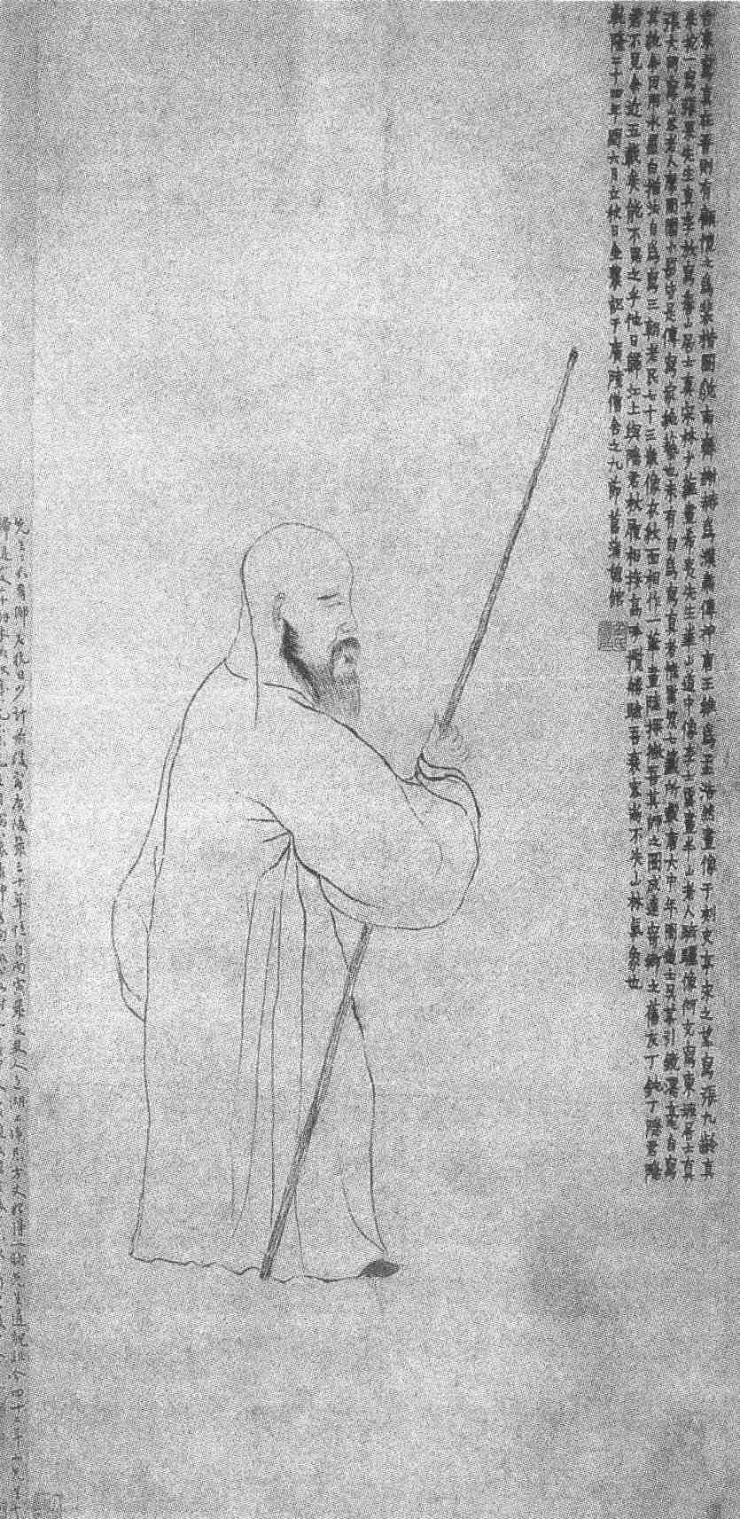 《自画像》是金农七十三岁时的作品。屈指算来,他涉入画坛,已二十年有余了,尽管不计较画法上的得失,这二十多年的涂抹,也应存些经验,懂些门道,能画出些模样来了。他取侧而避正,是从易弃难的经验;他就简而去繁,用纯粹的白描,发挥笔法和概括力强的优势,是扬长舍短的门道。虽然头部的比例和身首的比例失调,头部构结也不准确,眉、眼、鼻、耳、嘴、颚以及须髯的各部件有拼凑的痕迹,握杖的手更是生疏得无形可言,但由于种种失调、种种不准确或不甚准确,倒是端正了情趣——金农特有的生拙生钝趣;由于是拼凑,出现了貌略似而神相合的境界——气韵生动。此图的白描手法高明,变化细微,这正是他多年修练的铁线篆笔在画上的反映,线条细劲空灵,刚中见柔,柔中有刚,可吮可咀,耐人寻味。漆书长跋,在说了一大段历代肖像的故实后,转入自画像,说自己“用水墨白描法自为写三朝老民七十三岁像,衣纹面相,作一笔画。陆探微,吾其师之。图成远寄乡之旧友丁钝丁隐君。隐君不见余近五载矣!能不思之乎?他日归江上与隐君杖履相接高呼揽胜,验吾衰容,尚不失山林气象也”。文字情真意切。丁钝丁即篆刻西泠八家之首的丁敬,是金农的同乡密友。