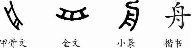 “舟”是象形字。甲骨文、金文都像一只带有隔板的小船之形。小篆发生了一些变化,上端的曲线很像船尾的舵。隶变后楷书写作“舟”。