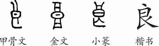 “良”是象形字。甲骨文下部为“豆(食器)”形,上部的两条线表示豆中的食物散发着香气。金文与甲骨文相似。小篆的形体线条化。隶变后楷书写作“良”。