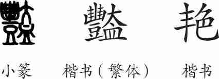 “艳”是形声字。小篆从豐(丰),盇(盍)声。隶变后楷书写作“豓”(豔),俗作“艷”。汉字简化后写作“艳”。