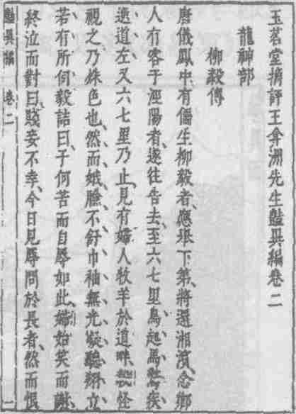 《神部》多述神女与凡人的恋情,其中不乏传世名篇。如记“柳毅传书”故事的《柳毅传》;“裴航蓝桥”故事的《裴航》等。许多篇章歌颂了男女间纯真的爱情,或对薄倖之人的谴责。《郑德璘传》叙郑德璘途经洞庭湖常与一渔叟欢饮。一日,德璘于邻舟韦氏处吟诗,为韦女所欣慕。德璘亦爱韦女娇美。后韦氏舟覆,德璘思恋韦女,作诗酹酒祭于江上。悼亡诗传入龙宫,龙王却是渔叟真身,念及德璘情分,遂放韦女还生与德璘结合。后德璘选巴陵令,韦女往龙宫探望父母,龙王再次叮嘱韦女好生珍惜与德璘的情分。《洞箫记》则叙徐鏊对神女始乱终弃的不义行为。