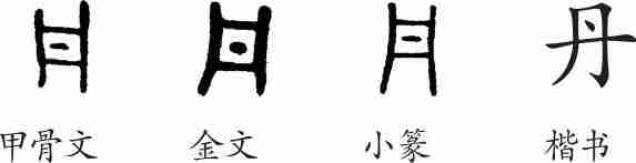 “丹”是指事字。甲骨文像一口矿井,井中的一小横像矿井中的矿石丹砂。金文中,一小横变为一点。小篆线条化。隶变后楷书写作“丹”。