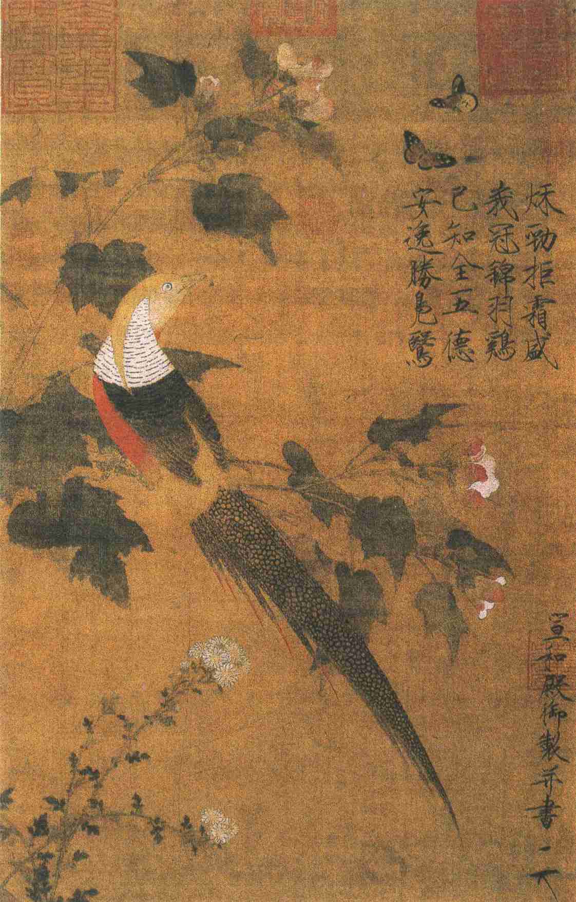 此图画芙蓉锦鸡,疏疏的芙蓉枝梢上蓦然飞临一锦鸡,压低了枝头,叶梢还在微微颤动;而锦鸡作转颈回顾之态,翘首看着右上角一对流连彩蝶翩翩而飞。其诗意之旨归,尽在画意中。赵佶的美学思想,于绘画则注重:一、诗意的含蕴回味;二、观察物象的细致入微和写实表现的传神精切。本图亦复体现如是。如状物工丽,神情逼肖,芙蓉枝叶之俯仰偃斜,精微入妙,每一片叶均不雷同,各具姿态,而轻重高下之质感、空间感,耐人咀嚼。锦鸡之神态,全身毛羽,设色鲜丽,曲尽其妙,俱为活笔。左下几枝菊花斜出,添出构图之错综,渲染金秋之气氛,衬托全幅之位置高下,而将下角空白破去(使不平板),造成全局气势之上贯,斜向右上角,凝神于双蝶飞舞。用笔的精娴,双钩设色的功力,空间分割的自然浑成,均足以代表宣和时代院体画的水平。工笔画之典雅与匠俗区分,关键在于胸次修养的内营,运笔的动力节奏感和诗意的构成。质诸此幅,可资多思。唯赵佶画传世之作面目颇不一,当非尽出自亲笔,此轴可能为画院中高手代笔,而赵佶亲加题识,后世多目为徽宗画,但确是院体画中上乘之作。