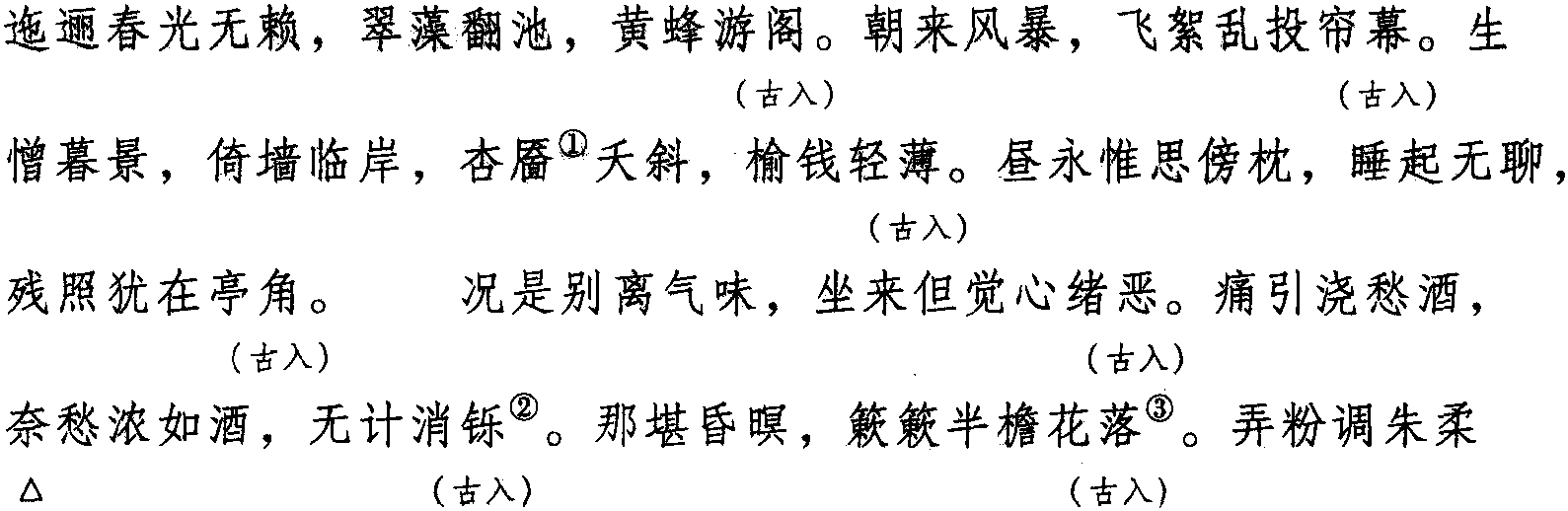 注:一、本词例押古入声“药”“觉”韵。因“恶” “乐”在古韵中与“药” “觉”同韵,而“恶”“乐”属现代韵“歌”韵,故全调可押歌部“歌”韵。