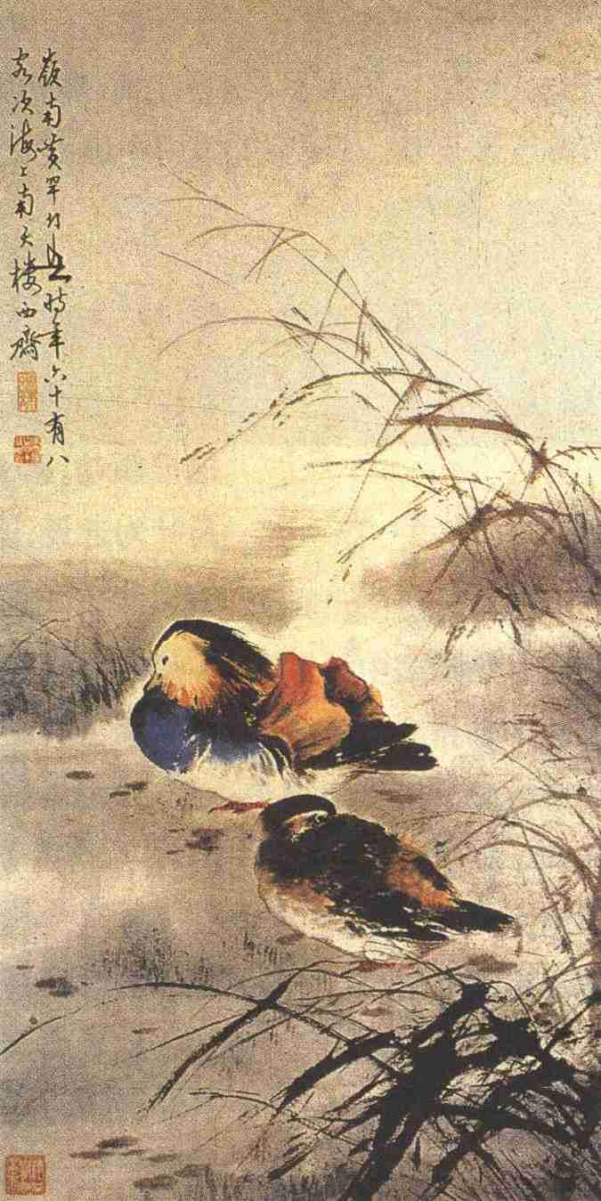 鸳鸯画得形神兼备,把中国画中半写意的点垛法掺入了西洋水彩画的光、色之技,合绘而成,雄鸟胸部掷以重青,翅尖敷用朱砂,上色颇见古艳沉着,也切合三秋季节的叶落霜清、天高夜永的时景。