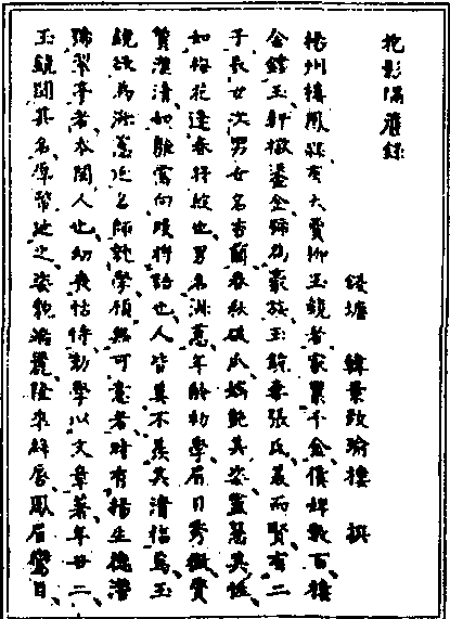 清代文白相间中篇艳情小说。一名《抱影隔帘录》,又名《花影隔帘》。四部。分题“钱塘韩景致瑜楼撰”、“钱塘陈景戏春翁阅”、“钱塘王隆愁痴人补阅”、“钱塘魏素珠吹箫媪订阅”。作者生平不详,或非汉人所作。成书于清末。