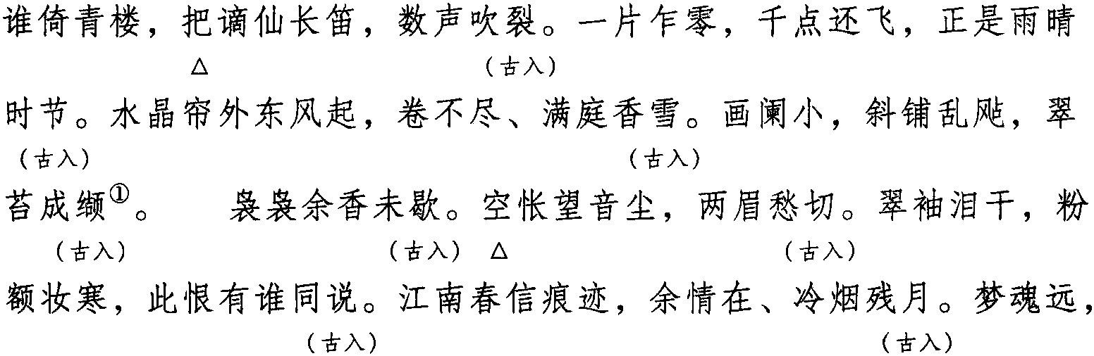 注: 一、本词例押古入声“月” “屑” 韵。因“月” “屑” 在现代韵中属 “些”韵,故全调可押些部“些” 韵。