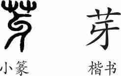 “芽”是形声兼会意字。小篆从艸,牙声,牙兼表小之意。隶变后楷书写作“芽”。
