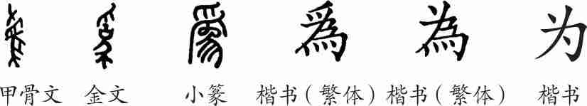 “为”是会意字。甲骨文上部为手,其下是仰着头、尾朝下的一头大象,会手牵着大象去劳动之意。隶变后楷书写作“為”和“爲”。汉字简化后写作“为”。