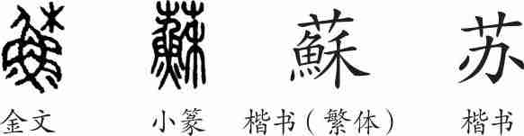 “苏”是会意兼形声字。金文写作“稣”。小篆另加义符“艸”(艹),从艸从稣会意,稣兼表声。隶变后楷书写作“蘇”。汉字简化后写作“苏”。
