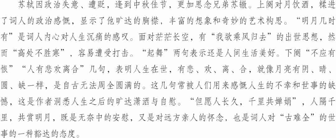 苏轼这首《水调歌头》,是中秋词中最着名的一首,他以精湛的笔触,刻画了一个完美的意境;以宽阔的胸襟、丰富的感情抒发了人生的哲理,使读者面对现实,热爱生活。