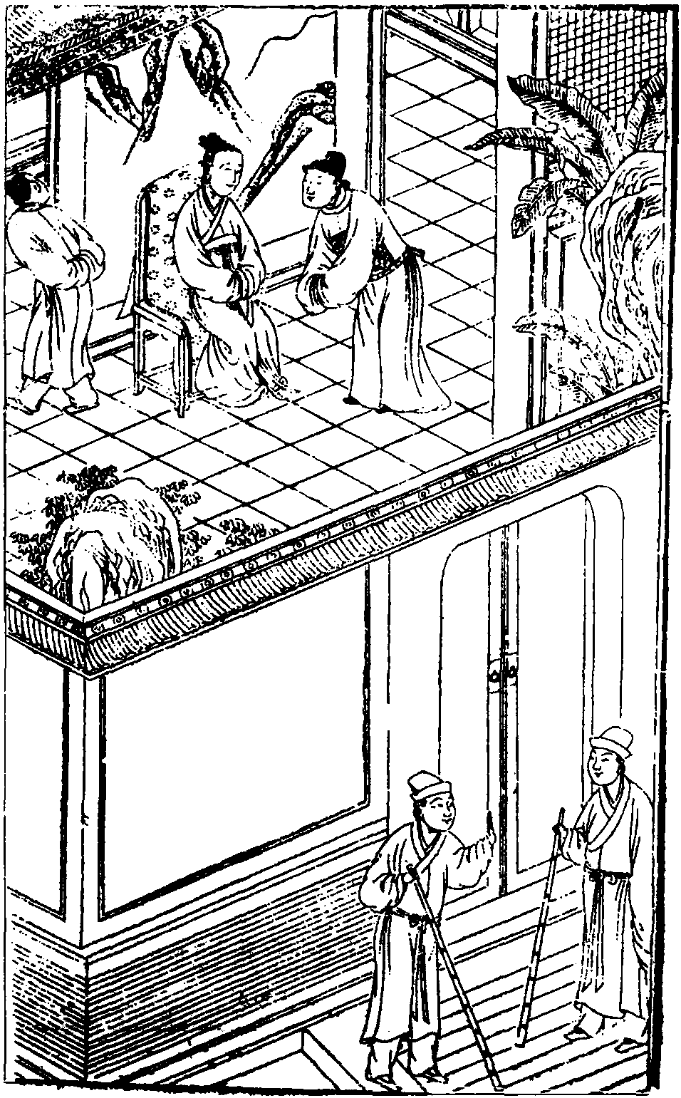 【前腔】 (老旦) 心中自三省,转教人愁闷增。你媳妇多灾多病,况亲家两鬓星,家务事要支撑。教她怎生离乡背井?为你饶州之任恐留停,儿,你岳丈先令人送我到京城。