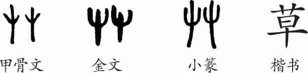 “草”是形声字。甲骨文像百草丛生的样子。金文、小篆大体上还能看出草的样子。隶变后楷书写作“草”。